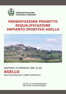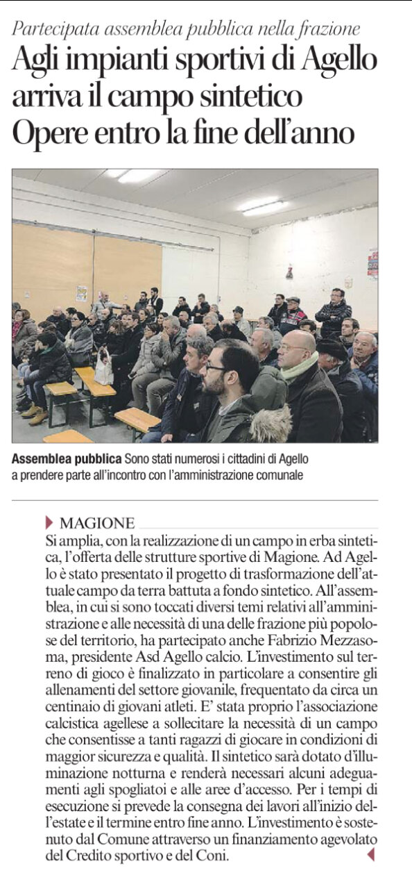 Campo in sintetico per sostenere il settore giovanile Con la realizzazione di un campo in erba sintetica – i cui lavori richiederanno diversi mesi dell’anno 2018 – s’incrementa l’offerta delle strutture sportive presenti nel territorio comunale di Magione. Il nuovo progetto si aggiunge agli altri in fase di realizzazione riguardanti i terreni di gioco di Magione capoluogo e delle frazioni di Sant’Arcangelo, Villa-Soccorso e San Savino. Il sintetico di Agello è stato presentato, nel corso di un affollato incontro pubblico. L’assemblea – utile ad affrontare diversi temi relativi all’amministrazione comunale e alle necessità della frazione – ha visto la partecipato dell’Asd Agello con il presidente Fabrizio Mezzasoma. Per la società l’obiettivo è avere un campo adeguato agli allenamenti e alle partite del settore giovanile e della prima squadra. Il sintetico sarà dotato d’illuminazione notturna e renderà necessari alcuni adeguamenti agli spogliatoi e alle aree d’accesso alla struttura. L’investimento consentirà di rafforzare e qualificare il luogo di maggior socializzazione del frazione di Agello.