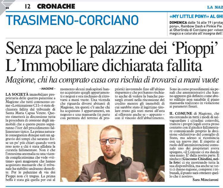 MAGIONE – Giustizia amministrativa e civile complicano la vicenda delle quattro palazzine prive di agibilità in via dei Pioppi a Magione, la cosiddetta lottizzazione C11. Il tribunale di Santa Maria Capua Vetere ha infatti avviato il procedimento fallimentare nei confronti della proprietà, nominando una specifica curatela. Una novità che segue di poche settimane la pubblicazione della sentenza del Consiglio di Stato che conferma come “non sanabili amministrativamente” le difformità relative ai sottotetti. Da parte dell’Amministrazione comunale, che esce di nuovo – anche in quest’ultimo grado di giudizione – del tutto sollevata da eventuali responsabilità, viene lanciato l’allarme sul “tempo perduto per dare una soluzione definitiva alla vicenda” e, soprattutto, la necessità di “tutelare le famiglie che hanno investito in buona fede”.