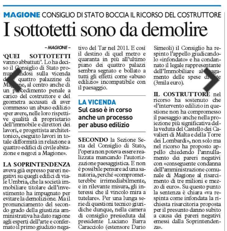 Consiglio di Stato mette la pietra tombale sull’ipotesi di sanatoria Il Consiglio di Stato ha ribadito che l’altezza superiore a quella di progetto rende i quattro palazzi non sanabili dal punto di vista amministrativo. Un errore del costruttore che, dopo l’ultimo grado di giudizio, diventa complicato rimuovere. In tutto questo è interesse dell’amministrazione che le famiglie che hanno investito soldi nella lottizzazione possano essere tutelate, sia dal punto di vista economico che abitativo”. E’ questo il commento rilasciato dal sindaco di Magione Giacomo Chiodini a margine della sentenza del Consiglio di Stato, ultimo grado della giustizia amministrativa italiana, in merito alle quattro palazzine di via dei Pioppi a Magione, meglio conosciute come “lottizzazione C11”. I giudici hanno infatti confermato la posizione del Tar Umbria, contraria ad una sanatoria dei volumi tecnici in realizzati da Centro Immobiliare Spa in difformità al progetto: un’ipotesi in parte sostenuta anche dal Comune, ma non dalla Soprintendenza ai beni paesaggistici dell’Umbria.