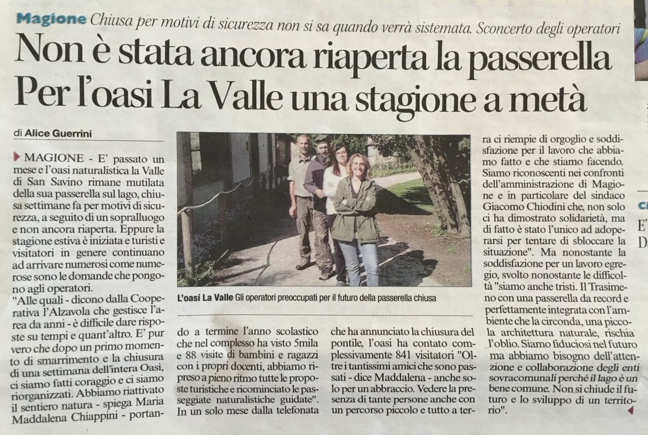 Da quando esistono le serie storiche sul turismo al Trasimeno non c’è mai stata una stagione con una percentuale di crescita così significativa come quella registrata in questi primi mesi dell’anno 2016. Il territorio attorno al lago tornerà con tutta probabilità sopra il milione di presenze turistiche, meta non più raggiunta da almeno un decennio. Una stagione d’oro insomma. Eppure se il turismo è partito a razzo, la manutenzione del Trasimeno non è mai stata così in affanno. Con un livello ottimale delle acque che oscilla attorno allo zero idrometrico, si assiste per paradosso ad una gestione del bacino che fa – è davvero il caso di dirlo – acqua da tutte le parti. La vicenda più nota è quella dell’Oasi La Valle a San Savino. Porta d’accesso al parco naturale e luogo ricco di fascino. Il cuore dell’attrazione è il pontile-camminata, ma ad oggi risulta fuori uso per una certificazione di sopraggiunta inagibilità spedita tramite pec ai gestori, la cooperativa Alzavola che vive sulla vendita dei biglietti d’ingresso, da un solerte funzionario della Provincia.