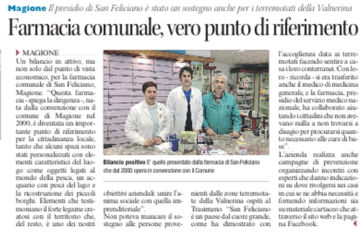 Il personale e le attività Vi lavorano un direttore di sede, Carla Rossini, un farmacista collaboratore, Giacomo Grasselli, e un commesso, Sergio Bigi. Inoltre si fanno corsi per la cittadinanza che vanno dalla cosmesi all’integrazione, iniziative sportive e culturali con i nuovi e vecchi cittadini. L’azienda realizza anche campagne di prevenzione organizzando incontri con esperti che danno indicazioni su dove rivolgersi nei casi in cui se ne abbia necessità e fornendo informazioni sia su materiale cartaceo che attraverso il sito web e la pagina Facebook. Tra le prossime iniziative a San Feliciano l’incontro, il 15 febbraio, con alcuni operatori del Centro Usl Umbria 1 per i disturbi del comportamento alimentare.