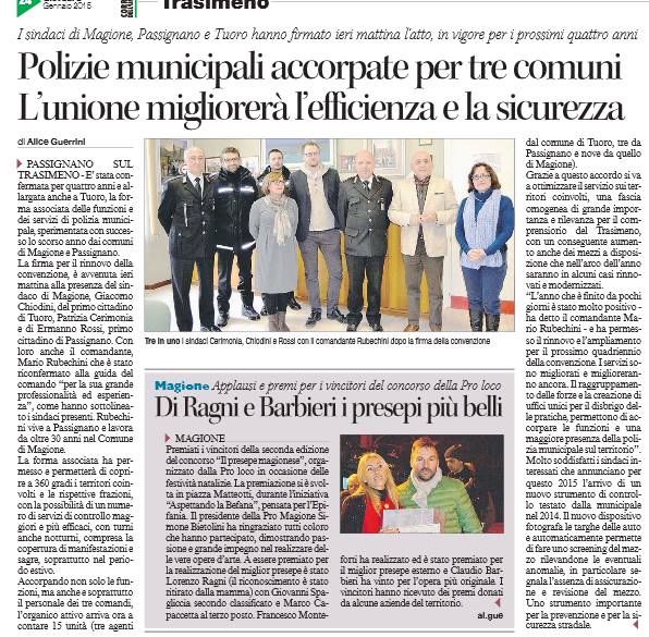Un corpo di polizia locale unificato per i tre comuni della costa nord-est del lago Trasimeno. Alla guida degli agenti della municipale i sindaci Ermanno Rossi di Passignano, Patrizia Cerimonia di Tuoro e Giacomo Chiodini di Magione hanno individuato il comandante Mario Rubechini, da 30 anni al servizio del comune di Magione. La convenzione, che durerà quattro anni, segue la sperimentazione avviata l’anno scorso tra Passignano e Magione aggiungendovi il Tuoro, la realtà più piccola delle tre. La forma associata permetterà di migliorare il livello di controllo del territorio, con la possibilità di un numero di servizi di maggiori, con turni anche notturni e una maggior copertura di manifestazioni, eventi e sagre. Accorpando i tre comandi, l’organico attivo arriva a contare 15 unità (tre agenti dal comune di Tuoro, tre da Passignano e nove da Magione). Grazie a questo accordo si va a ottimizzare quindi il servizio sui territori coinvolti con un conseguente aumento anche dei mezzi a disposizione che nell’arco dell’anno saranno in alcuni casi rinnovati e modernizzati. Molto soddisfatti i primi cittadini dei Comuni interessati che annunciano inoltre per questo 2015, l’arrivo di un nuovo strumento di controllo testato dalla municipale nel 2014. L’innovativo dispositivo, fotografa le targhe delle auto e automaticamente fa uno screening del mezzo rilevandone le eventuali anomalie, in particolare segnala l’assenza di assicurazione e revisione del mezzo. Uno strumento importante per la prevenzione e per la sicurezza stradale.